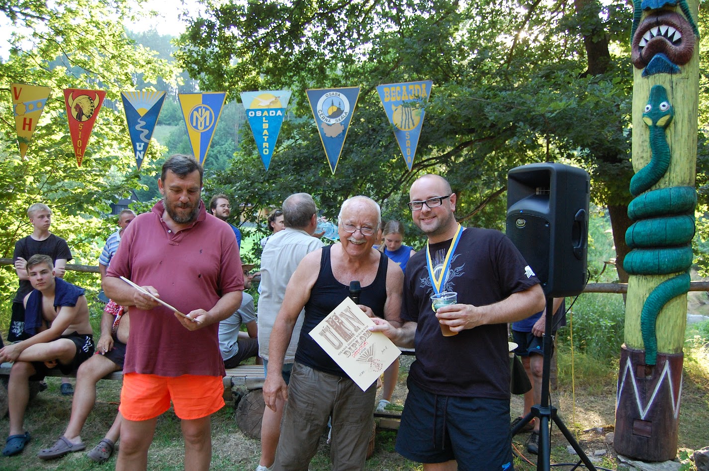 Vlastně jsem chtěl mluvit o lidech. Dlužno vzpomenout všechny Skopcovi (Karel st. jako šéf poroty, Karel ml. jako šéf organizace, Mirek jako organizátor), Mirise, co zajišťuje spokojenost konzumentů, Mirka Vrlu, co pečuje o osadní vystoupení a také o klipy (bude řeč dále), Karla Zieglera, co udělal totem a má na starost výzdobu, Agráru a Ivana Znášíka, co fungují jako osvětlovači saloonu a okolních terénů, všechny osadníky, kteří se zúčastňují brigád, Jardu Hrušku, co se letos s řadou ostatních zasloužil o znovupostavení Dubské lávky, manžele Krchovi, co čepují od půlnoci do rána, i všechny ostatní, co čepují přes den a večer. No – a tutově jsem zase na někoho zapomněl.